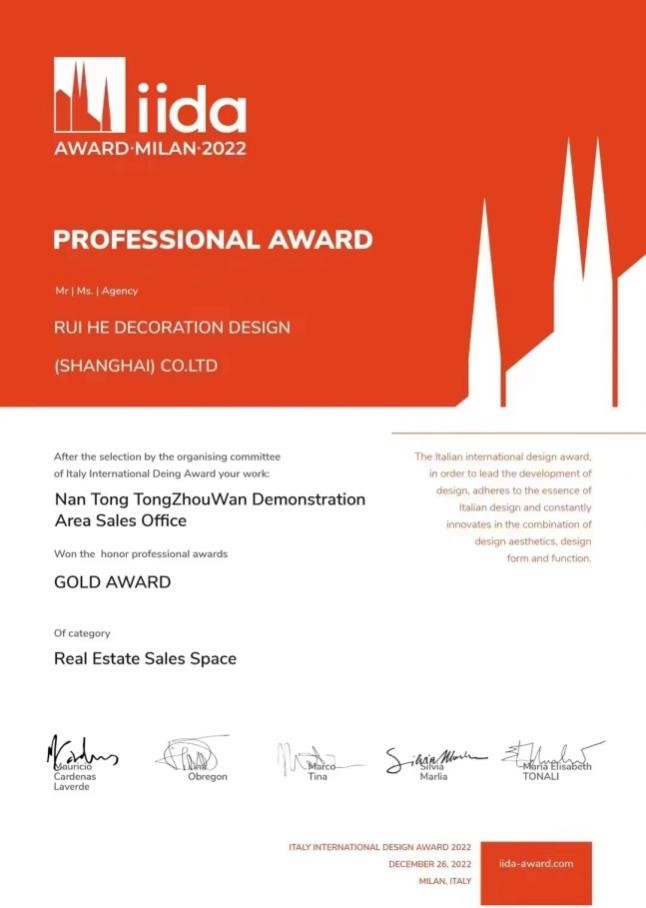 近日,盛和房產(chǎn)開發(fā)的盛和?灣上文華項(xiàng)目(通州灣TR20011地塊)示范區(qū)售樓處設(shè)計(jì)方案從全球包括意大利、法國、西班牙、日本、韓國、中國及港澳臺(tái)等幾十個(gè)國家地區(qū)的設(shè)計(jì)師和設(shè)計(jì)機(jī)構(gòu)近千套設(shè)計(jì)作品中脫穎而出,斬獲2022意大利IIDA AWARD國際設(shè)計(jì)大獎(jiǎng)地產(chǎn)售樓類金獎(jiǎng)。